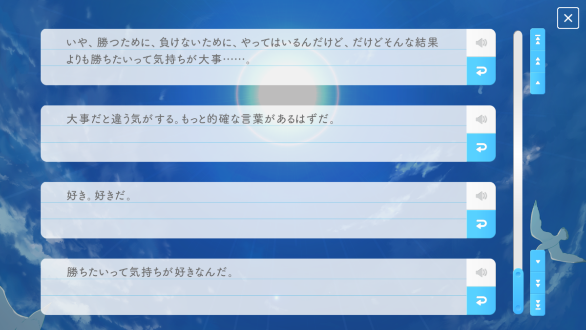 負けたくないは勝つと同義で必死さや余裕の無さが隠れています。勝ちたいは、その言葉の奥に楽しむという感情が隠れていると思います。莉佳ルートで僕が感じたテーマです。