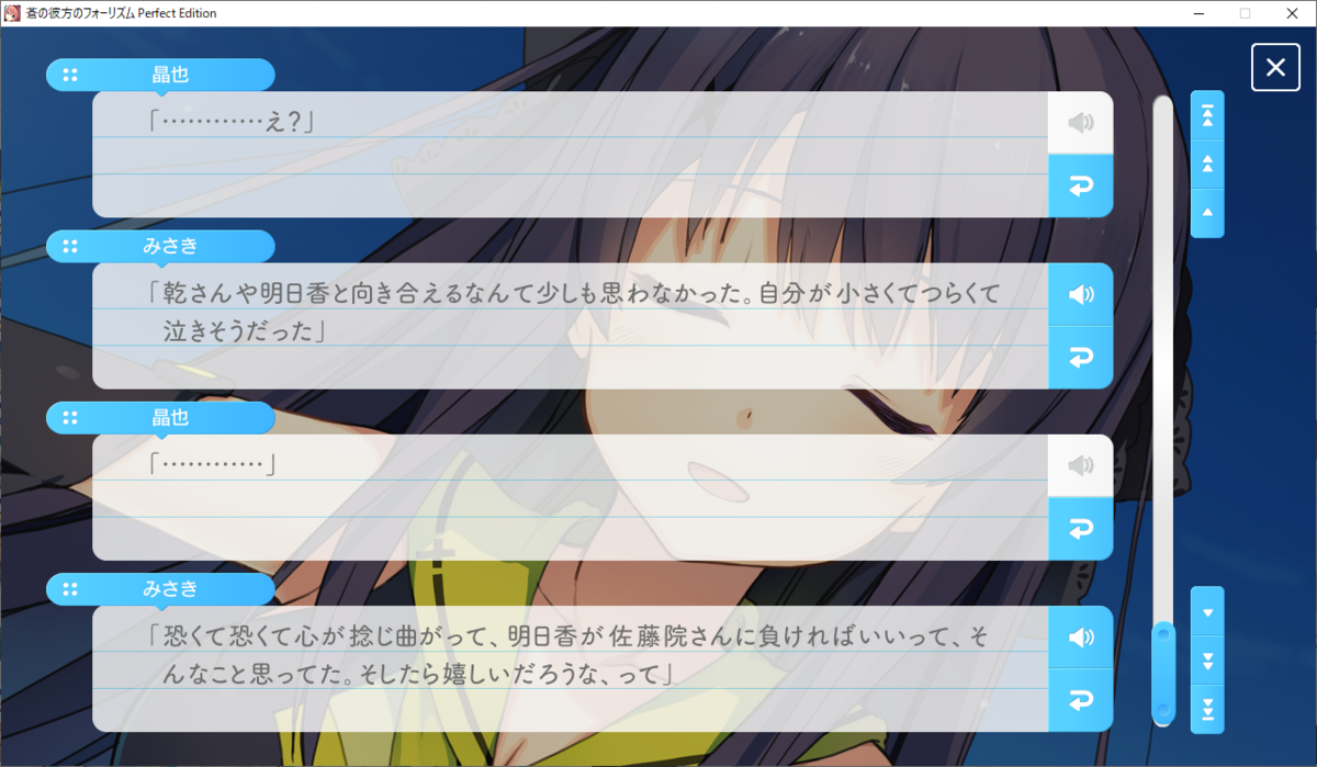 シナリオに関しては、みさきと主人公は同じものに囚われていて、そこから抜け出せるのかってのだと思います。弱いもの同士の2人ががむしゃらにもがいて光を目指す展開好きです。